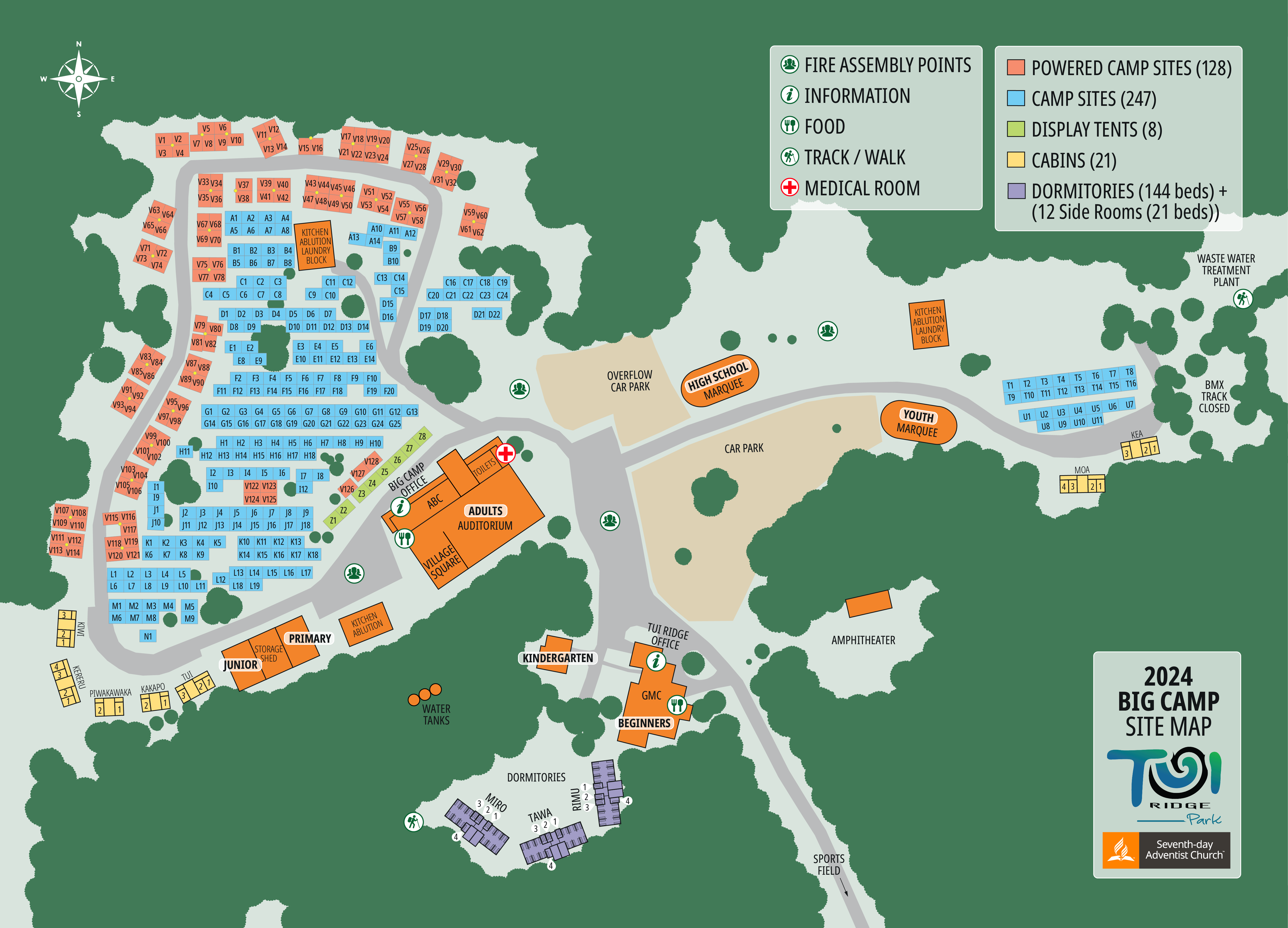 Every second year, in January, the North New Zealand Conference of the Seventh-day Adventist Church holds Big Camp at Tui Ridge Park. This is where church members come together for nine days to worship, fellowship, and grow spiritually. It is a family camp and caters for all age groups.